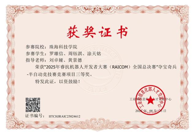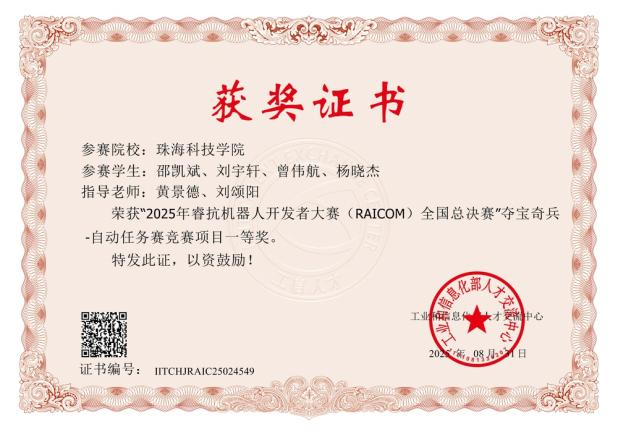 睿抗机器人开发者大赛(RAICOM)由工业和信息化部人才交流中心主办。在2025 年睿抗机器人开发者大赛(RAICOM)中,我校参赛队伍在精度、效率、创新等多维度评审中表现突出,荣获国家级一等奖1 项、二等奖4 项、三等奖1 项,省级二等奖6 项。