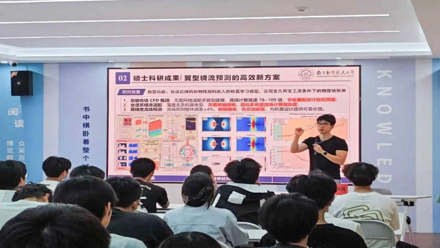 在科研分享环节,卢泽凯聚焦航空航天科学技术与智能体技术融合创新领域,重点围绕推进动力系统流场物理智能建模研究方向展开详细讲解。他用通俗易懂的语言,深入浅出地科普了物理信息神经网络(PINN)的核心原理与技术优势,以及该技术在航空航天、能源动力等领域的广阔应用场景,并对比分析了PINN相较于传统计算流体动力学(CFD)方法在计算效率与精度上的显著突破。同时,他结合自身丰硕科研成果——以第一作者身份发表多篇SCI一区论文、拥有多项授权发明专利、参与上海商飞与航天三院等重点科研项目,鼓励同学们积极培养跨学科融合的思维能力,立足专业实际,在实践探索中解决问题、提升核心竞争力。